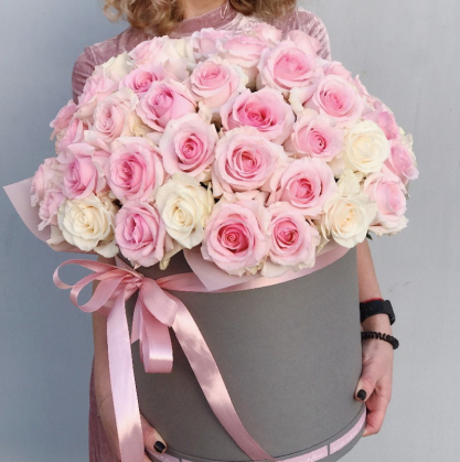 Большая коробка с белыми и розовыми розами