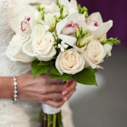 Невероятно красивый букет из эквадорских белых роз, идеальных орхидей и фрезий с добавлением листьев салала. Бутоньерка и пакет лепестков в подарок!