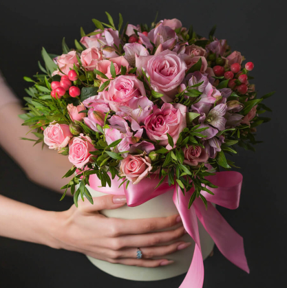 Букет в коробке из кустовых роз и альстромерии | Купить в Электростали