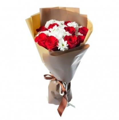 Изящный букет из розы и кустовой хризантемы.